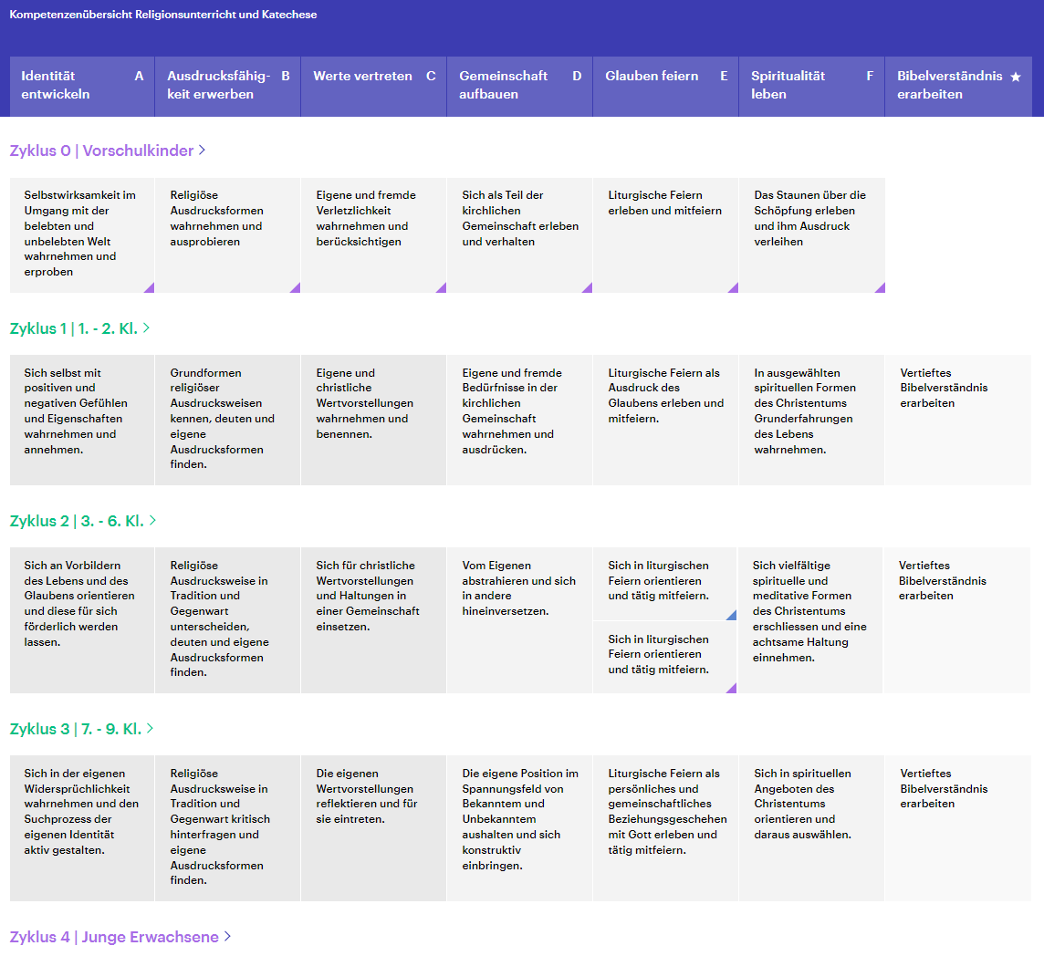 Um die beschriebenen Kompetenzen innerhalb eines Kompetenzbereichs zu erreichen, sind Teilkompetenzen formuliert, die auf die Jahrgangsstufen verteilt wurden. Damit die Suche nach der passenden Teilkompetenz innerhalb eines Zyklus leichter fällt, wurde die Teilkompetenzenübersicht geschaffen. Gerade für Religionslehrpersonen und katechetisch Tätige, die mehrere Klassen unterrichten, bietet diese Ansicht eine bessere Übersicht zur Auswahl. Die Teilkompetenzen sind als Bausteine für den Kompetenzerwerb zu verstehen. Sie bauen meist aufeinander auf und greifen Aspekte der Kompetenz auf. Wird an einer Teilkompetenz gearbeitet, ist der Blick auf vorangegangene Teilkompetenzen hilfreich, gerade dann, wenn womöglich "kleinere" Bausteine fehlen.