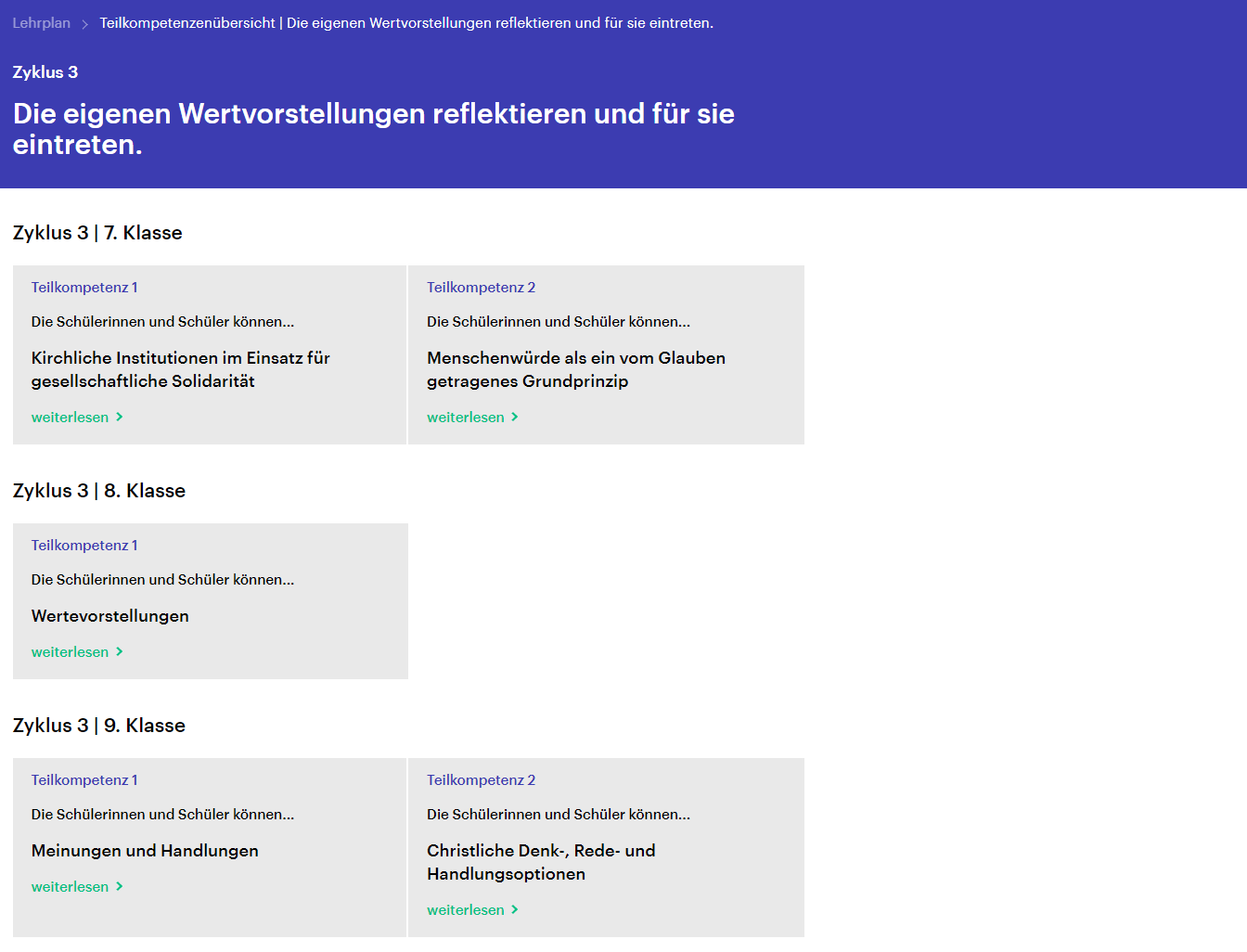 Auf der Startseite bildet die vorliegende Kompetenzenübersicht den Kern dieses Lehrplans. Hier sind Kompetenzbereiche definiert, die zur Gestaltung einer selbstbestimmten religiösen Glaubensbiografie hilfreich sind. Diese sollen es ermöglichen, christliche Identität zu entwickeln, religiöse Ausdrucksfähigkeit zu erwerben, christliche Werte zu vertreten, christliche Gemeinschaft aufzubauen, christlichen Glauben feiern und christliche Spiritualität leben zu können. Grundlage zur Arbeit an Kompetenzen sind hauptsächlich biblische Texte. Darum soll auch ein vertieftes Verständnis von biblischen Texten entwickelt werden. Die einzelnen Bereiche sind jeweils näher beschrieben und unter den entsprechenden Kacheln hinterlegt.