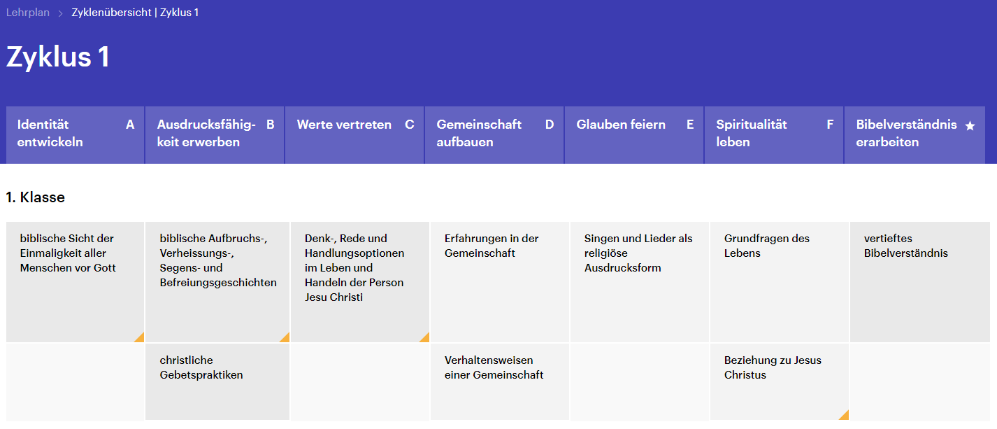 Die Angaben zum Kompetenzbereich und der entsprechenden Kompetenz dienen der ersten Orientierung. Dabei sind die Kompetenzen zusätzlich mit Zahlen von 1 bis 3 und Buchstaben von A bis F gekennzeichnet. 2 B bedeutet zum Beispiel: Zyklus 2, mit dem zweiten Kompetenzbereich "religiöse Ausdrucksfähigkeit" erwerben.